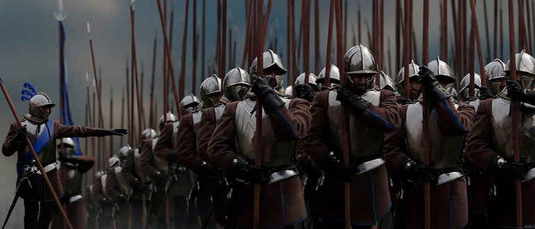 Отчасти это связано с новым оружием — английским длинным луком и швейцарской алебардой. Но изменение также предполагает возвращение очень древней тактики. Греческая фаланга, с длинным копьем, введенным Александром Великим, возрождена в разрушительный эффект швейцарских крестьян, вооруженных копьями.