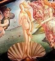 Его характерный стиль виден в двух из самых любимых и наиболее широко признанных картин эпохи Возрождения. Рождение Венеры (ок. 1482) является традиционным сюжетом (в классической мифологии богиня рождается из пены морской и всплывает на берег в раковине гребешка). Но высокая обнаженная фигура и сопровождающие ее ветры, поразительно оригинальный способ изображения этой сцены.
