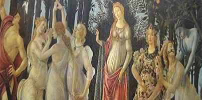 В Primavera (Весна, ок. 1478) сама сцена глубоко таинственна. В апельсиновой роще танцуют три грации, а Флора рассыпает цветы по земле. Она одета в изысканно расшитое цветочное платье, и ее сопровождает женщина, у которой изо рта энергично растет растение. Эта женщина, в свою очередь, схвачена мужчиной в полете.