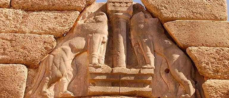 В самих Микенах таким примером могут служить ворота в крепостных стенах, они как символ власти, с двумя большими львами, стоящими напротив друг друга.