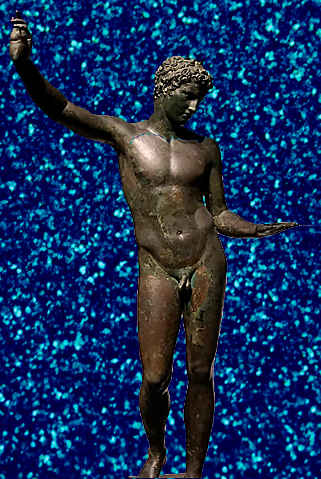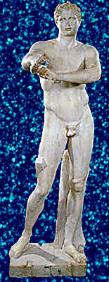 Апоксиомен, или человек чистящий себя, посредственная мраморная копия, почти шесть футов девяти дюймов, предположительно бронзовой статуи около 330 г. до н.э., и, возможно, Лисиппа. Тусклость деталей, которая проявляется особенно в выражении лица, может быть ошибкой скульптора-копировальщика, но в первую очередь Апоксиомен кажется упражнением в создании статуи, которая больше не зависит от четырех основных позиций — передней, две боковые и спина. Это достигается путем вытягивания обеих рук в направлении, заметно отличающемся от направления туловища, так что сразу не очевидно, какой вид спереди является основным. Современному зрителю поза может показаться бессмысленной и надуманной, но первоначально левая рука держала стригил, своего рода длинную тонкую лопатку из бронзы, которой атлеты очищали себя после тренировки, и Апоксиомен использует ее правой рукой. Это явно сиюминутная, хотя и уравновешенная поза и положение ног находятся в гармонии. В своих пропорциях Апоксиомен следует новой системе, приписываемой Лисиппу, с меньшей головой и более длинными ногами, благодаря чему фигура выглядит более элегантной, и действительно, если посмотреть по отдельности на Дорифора и Апоксиомена — или их копии, — обычно складывается впечатление, что Апоксиомен выше, хотя по размеру — без постамента — их высота почти одинакова.
