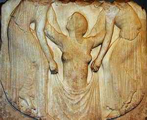 Этим объясняется также странный привкус архаичности в волосах центральной фигуры и лифе служителя справа, но позы обслуживающего персонала, остальная часть драпировки и выражение уцелевшего лица являются раннеклассическими, и есть неожиданная тонкость в складках ткани, незаметно удерживаемых служителями. Сюжет неясен, возможно, богиня или жрица, выходящая из ритуального омовения, или даже Афродита, поднимающаяся из моря. Это может быть около 460 г. до н.э., что совпадает с стилистически более продвинутыми скульптурами Храма Зевса в Олимпии.