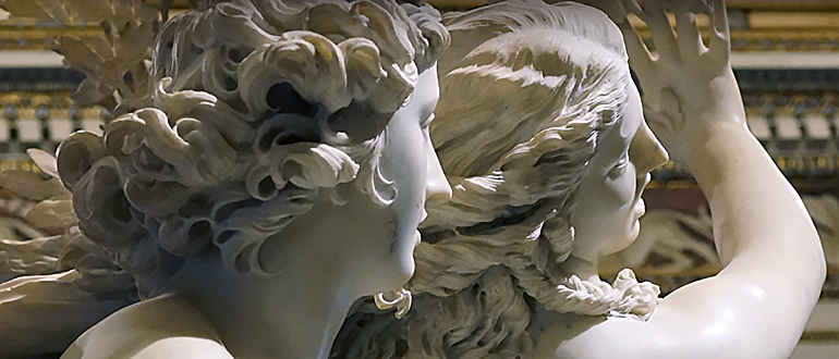 Другой особой характеристикой в скульптуре того периода — и самой важной — было появление движения. Статуи никогда не изображаются в неподвижности или в позах покоя, но всегда в действии, и наиболее характерно в тот момент наименьшего равновесия, который является кульминацией движения, незаметный, но драматический момент, например, когда прыгун больше не поднимается, но еще не начал опускаться и неподвижен, в позе потенциала, в воздухе. Желая изобразить Аполлона в погоне за Дафной, Бернини выбрал самый драматический момент, когда Дафна трансформируется в лавровое дерево, чтобы убежать от бога: момент кульминации действия. (Аполлон и Дафна (1622-25) Мрамор, Галерея Боргезе, Рим.)