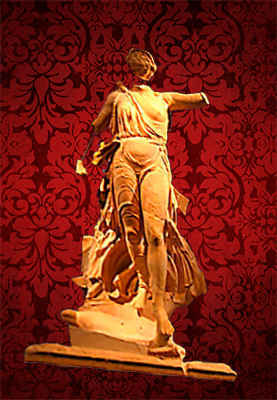 На виде спереди модельная линия используется с большим мастерством, так что задрапированное правое бедро кажется более округлым, чем обнаженное левое, а на виде сбоку линия движения имеет свой поворот. Но эти два вида не согласованы полностью, и вид на спину почти не рассматривался, хотя, конечно, его наклон сделал его не очень заметным с земли. Как и в одежде, драпировка не имеет особого смысла ни по массе, ни по тому, как она облегает правую ногу, не затрагивая при этом основных складок; но его функция заключалась в объяснении и улучшении фигуры, и это он превосходно выполняет в основных видах, даже если у человека больше нет помощи цвета, чтобы отличить друг от друга обнаженные части, пеплос, плащ, крылья и, вероятно, опору.