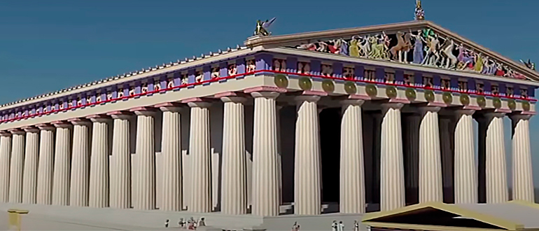 В каменных скульптурах Фронтоны Парфенона, вырезанные в течение двух или трех лет в 435 г. до н.э., были выполнены с удивительной тщательностью. Композиция отличается сложностью и утонченностью, к которым, насколько нам известно, даже не подходили ни в одном из более ранних или более поздних фронтонов. Сюжеты, подходящие для храма Афины, — это на востоке рождение этой богини, а на западе — ее борьба с Посейдоном за землю Аттики. И в том, и в другом случае действие находится в центре, а движение и внимание окружающих божеств угасает по направлению к углам, так что повествование не представляет особого интереса для дополнения эстетического эффекта, а успех зависел от рисунка, созданного многолюдным целым, и от совершенства отдельных фигур и групп.